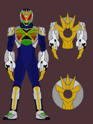 This is Sickle's standard form, obtained once he forms his contract with Deathblader. A melee-based Rider, Sickle is mostly the balanced type fighter. He uses the Death Visor resembles mantis' claw to use the Advent Cards.
