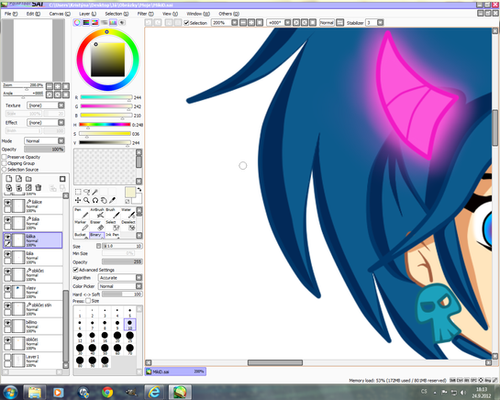 Heh, neat tutorial. If ya like, I have a tip...it makes the 'flasts' coloring layer a tad bit easier. For that layer, you go just beneath the tabs for 'layers' and whatnot to where there's the dropdown box that says 'normal'...switch that to 'multiply' and that allows you to color right over the black lines. The color only shows up on the white, and the black remains as crisp 'n clean as it ever was without any of the white stuff. I did a lil pic to show, 'cause it's really hard to properly explain: [link]