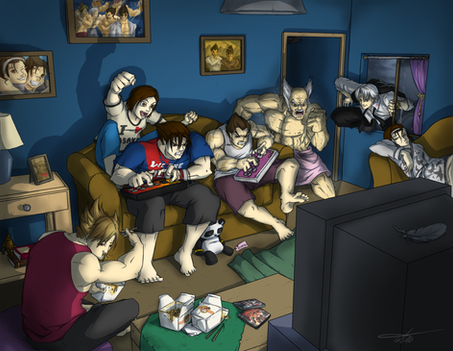 I always wanted to draw something like this..bringing my favourite characters doing something that normal people do...playing games is one of them...I know, there are tons of similar art like this out there..that's why I wanted to have my own..Btw, playing fighting games is my passion since I was a kid..in fact, it's the only game that I really interested to play especially if the games were made by Capcom or SNK... their classic collections are gold.. I just love retro fighting games, the feeling of playing a well-animated 2D characters and seeing it gloriously flashing in a CRT monitor is just priceless..there was a time that I thought fighting games will be forgotten, and die behind the shadow of other genres..but I do know, fighting games community is always there, alive, and keep on supporting the scene..Thanks to Capcom, SNK, Namco, Sega, Arc System Works, and many other fighting games developer, this genre of game is still alive and kicking ass..In fact, fighting games are getting more and more fans nowadays..the hype of international tournaments such as EVO is just an example of it..seeing those pro players showing out their skills in the tournaments give the other players playing at home and arcades the feeling of becoming as good as them...