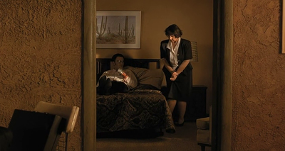 This is a nice echo of The Graduate. If she is putting on hosiery, though, she needs to have her foot and leg flexed. It is easier to put them on that way and it defines the leg muscles.