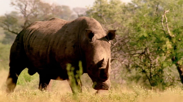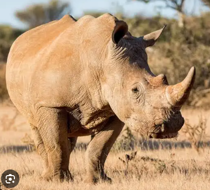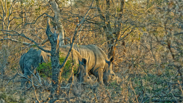 White rhinos are the second largest land mammal after the elephant. Adult males can reach 1.85m in height and tip the scales at a massive 3.6 tonnes. Females are considerably smaller but can still weigh in at an impressive 1.7 tonnes. White rhinos are also known as the square-lipped rhinoceros due to their square (not pointed) upper lip. Their name comes from the Afrikaans word “weit”, which means wide and refers to the animal’s muzzle. Compared to black rhinos , white rhinos have a longer skull, a less sharply defined forehead, a more pronounced shoulder hump. They have almost no hair and two horns. The front horn averages 60 cm, but occasionally reaches 150 cm in length.