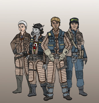 A rather cheesy (okay, very) tribute to my favourite pilots from the Star Wars galaxy. You'll have to read the Wraith Squadron books to understand why Wes Janson is holding a stuffed Ewok, I'm afraid. (That's a tribute to Aaron Allston). I don't know exactly how Tycho's blaster transformed into a mug of caf, but it might have something to do with Alderaanian influence, LOL.Clothes based on threads the late Edvin Biukovic designed for the X-Wing Rogue Squadron comics, and pretty much remained consistent throughout the X-Wing series.