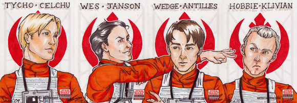 This is my favorite of the Rogues. I think its because Wedge has his eyebrow up like 'what the heck is Wes doing now?', Hobbie looks like he's trying to get Wes to 'lay off' while at the same time begging Wedge for intervention. Wes, of course, looks like he's planning something evil. And Tycho looks like he's just going to put his foot up, sit back, drink some caf, and enjoy the show. It's just perfect!