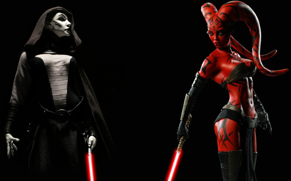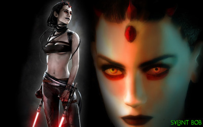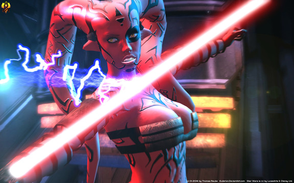 Once again your talent for lighting and colour have excelled! Eludajae looks especially good. Her eyes look really menacing and none of that is lost from the darkness and limited palette from the red lightsabre. I like how the shadows make her eyebrows look all the more powerful, drawing even more attention to the eyes. The lips of both women are great as well. They look almost like liquid.