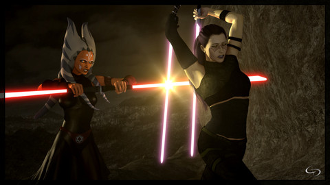 1. that lightsaber, the black blade (?) parts coming off of it, it took me like 5+ minutes to figure out it was part of the lightsaber, i thought she had cut through Ti's montral and a chunk of her neck, which didn't make sense to me but yeah. there needs to be some other form of contrast there because of the black background, to make it easier to understand that that is part of the lightsaber.