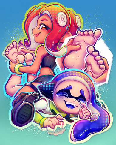 Tickling of the Splatoon girls? Well we didn't need to wait long for that, and I'm glad! For one, the characters are very cute, and two I'm glad you were the one to draw it. If I would like to say one thing about your art, it's that I really like your take on the overal anatomy. I really like how you don't make anime characters too thin, and too edgy. I really like how, for example here, the girls look rather realistic proportions wise. The colors are very nice too. the skin tone is creamy and adorable, while their hair and paint is just very pleasant to look at hehe. Background and discarded footwear is just icing on the cake, and I'd say 10/10 on the cuteness scale. Great Job!