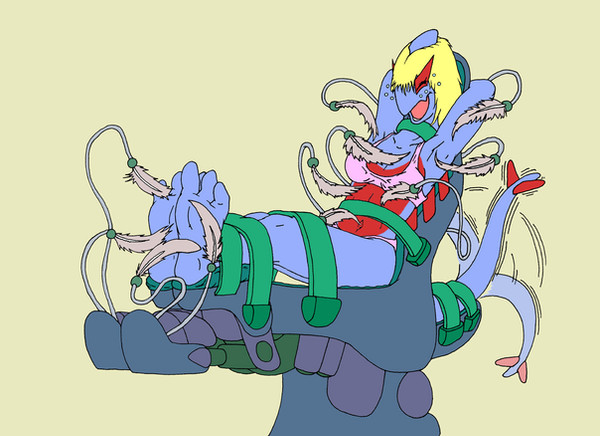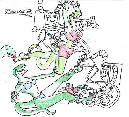 I love those upside down tickling scenarios. I loved your old pic with May already, but this one is even better. The expressions are great and the tickle machines are great as well. What's that thing covering her toes? Is it a device that is using feathers to tickle between her toes?