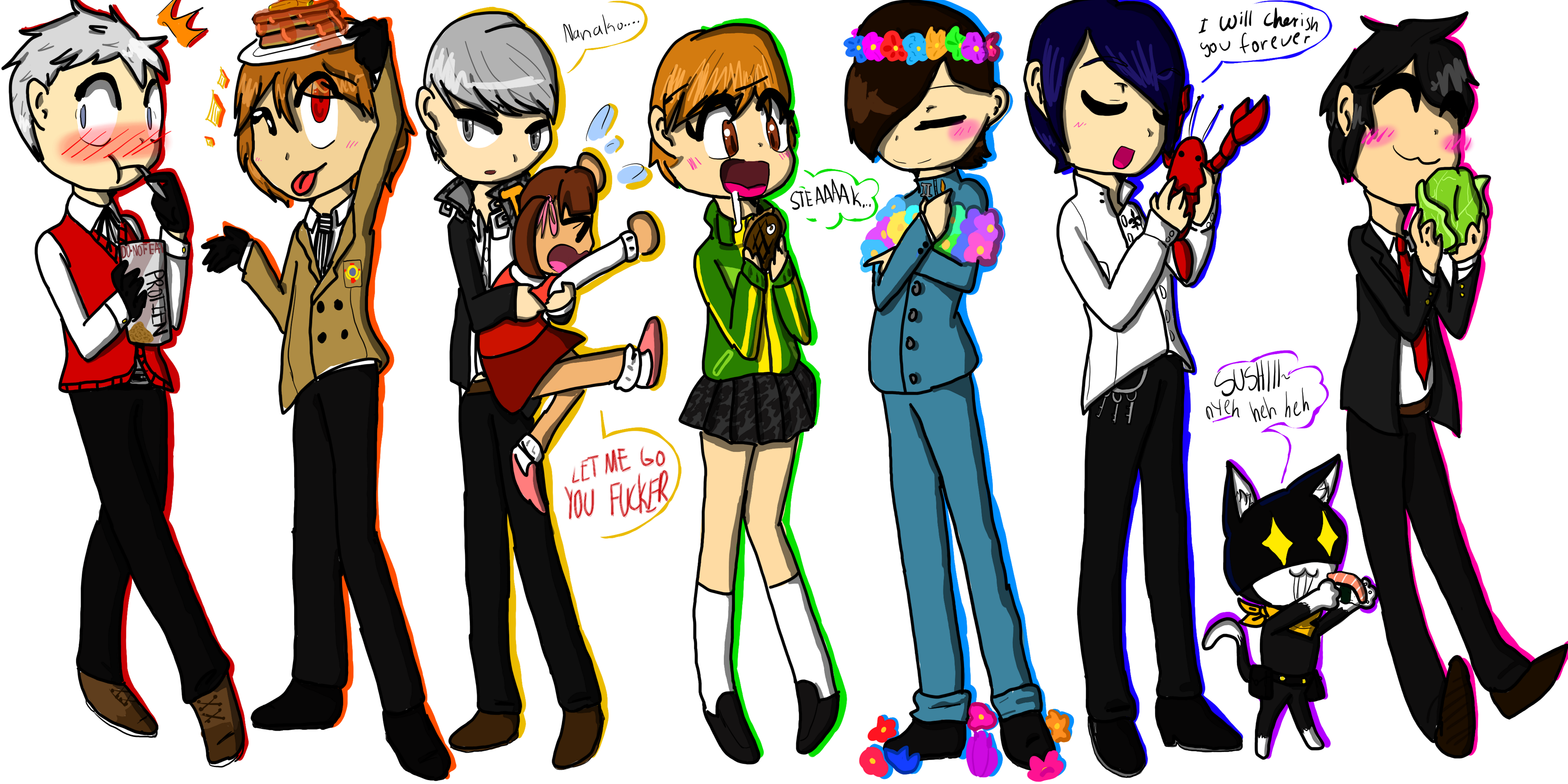 persona 4 my belovedi love yu, and teddie, and adachi-baby, and dojima, and yosuke especially, and never forget nanako. i generally hate children in anime and stuff cuz they annoy the living shit outta me but nanako is an adorable little bean OH MY GOOOODDD also ken from p3 is cool. maiko (i think was her name) from p3 was alright too, her link was nice.