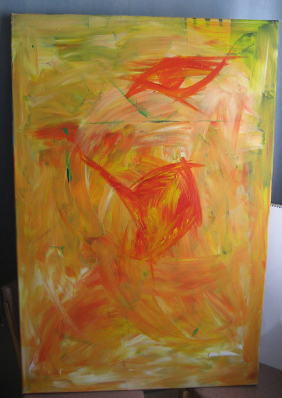 acrylic on torn paper pasted on canvas. (i accidently tore a hole in the canvas and had to fix it so I did using wheatpaste and heavy paper)