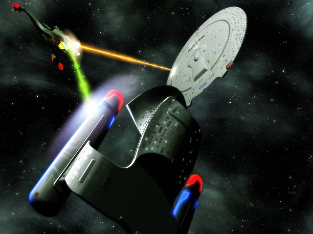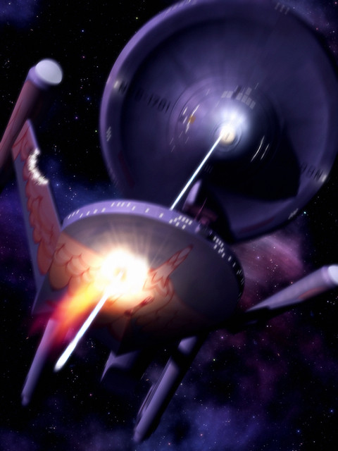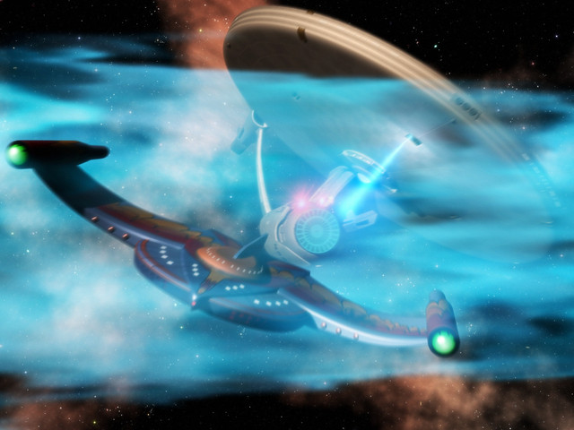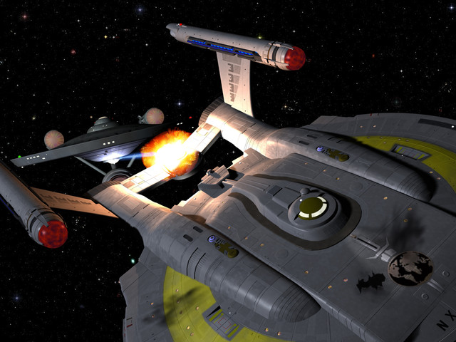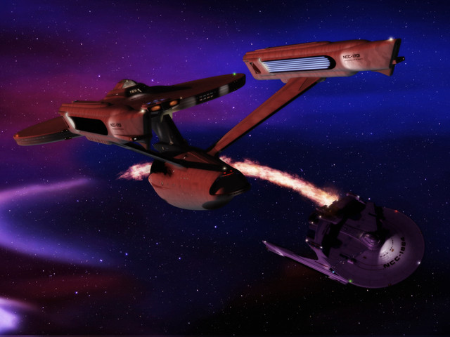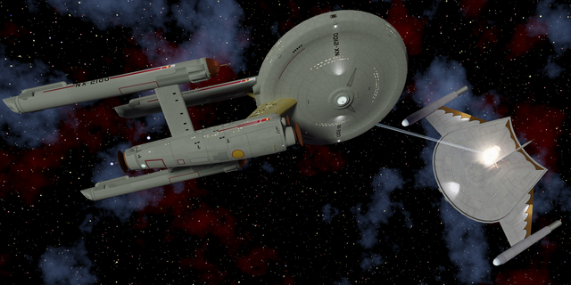 The ISS Lexington hunts the Rebel starship Polaris.I modified the Lexington to have a Phase II style neck and torpedo launcher, plus visible phaser emitters. She needs to be badass!