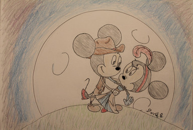 This is the end of the "Mickey's Rival". One of the few classic cartoons with these two that doesn't end in a kiss. Instead it's a friendly handshake, unlike "Mickey's Mechanical Man" haha. It's first appearance of Mortimer Mouse, he then disappears until the "House of Mouse" and "Mickey Mouse Works" cartoons. I wonder if he could have been in "Epic Mickey"? Fun Fact: Walt originally wanted to name his new mouse character Mortimer, after a pet mouse he had when he was little, but his wife convinced him to change it mostly because Mickey just sounds better. Anyway, the expressions were fun to draw since they contrast one another so heavily. This is my first drawing of classic Minnie and of any car I think. Now giving the car a face was a bit tricky, but I think the little fella turned out okay. I wonder if the car has a name?Mickey, Minnie, and the car belong to Disney.