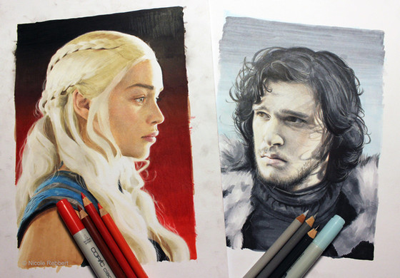 here's some work in progress for my new Daenerys artworks and a sample of all the tools I use. It's also important to have a paper that 'take' markers well, you do not want too much bleeding and just enough to make great shading and blending.I use smooth bristol/strathmore.