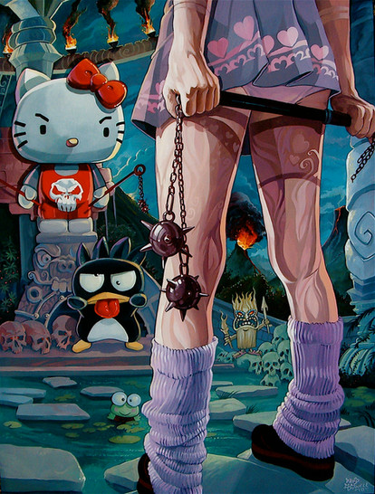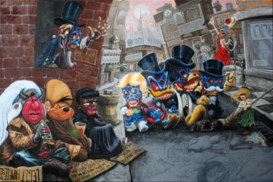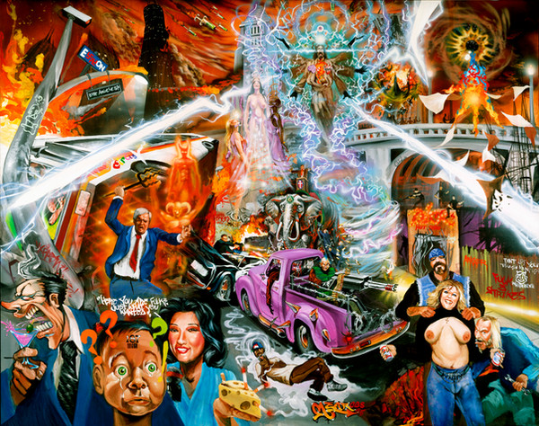 I love the crazy shit that goes on in these paintings, so many details to spot; love the little Charles Manson balloons. Good stuff