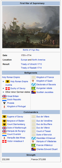 The Mediterranean War, called by some as the Second War of Italian Unification, was a conflict between the Kingdom of Lombardy, the Ottoman Empire, and their principal allies. Strife first rose between the Ottomans and Lombardy over the latter's claims on Tunisia, which was at that time held under suzerainty of the Ottoman Sultan. War broke out between the two after the Ottomans issued an ultimatum for Lombardy to abandon its claims. France, Carpathia and the Italian Confederation under command of Liguria, Tuscany and the Papal States declared war on Lombardy. In return, the Greek Empire declared war on the Ottomans and Hispania and the Netherlands issued their own declaration of war on France, against whom they had guaranteed Lombardian independence.Early in the War, France made some major gains in the Savoyard Front, even occupying the Lombardian capital, but the stabilization of the Hispanish front and a Dutch blockade on France in the Atlantic forced them to withdraw to fight against a three-front war. The Ottoman assaults against Constantinople failed, forcing them to lose much needed manpower -something Lombardy made good use of after a lightning-assault occupation of most of the Papal State, Tuscany and Liguria. Things became worse for the Allies when Carpathia made a separate peace with the Greco-Lombard alliance, leaving the war at the expense of annexing Bosnia -which had been a Greek vassal. France agreed to a ceasefire in 18 April, letting the Conference of Genoa to begin.