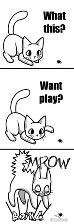 XD I could totally see my cat and rats doing that. We've got that one cat who just won't leave anything small and fuzzy alone, but only seems to want to poke them. >__< XD Then we have a very grumpy rat and a very quiet one who much prefers to boggle his eyes and twitch his whiskers than actually do anything about being touched. XD The one rat already went after the cat at one point and she's scared of him now... Great comic!