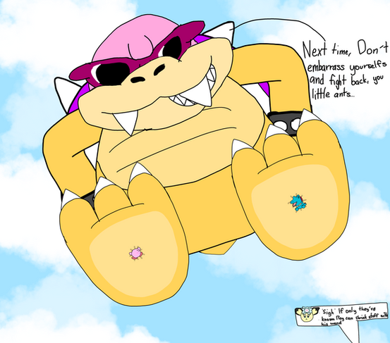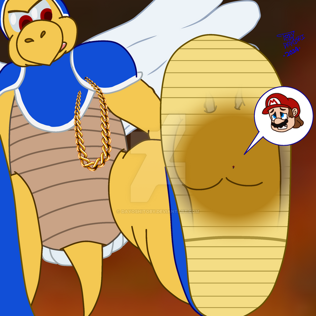 He have a idea, Kamek, the royal wizard can curse Mario and keep him at this tiny size, also Koopa General wanna see Kamek to shrink Mario smaller, hahahahaa!!!Meanwhile the big Koopa are having fun with his new squishy weaky toy.