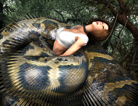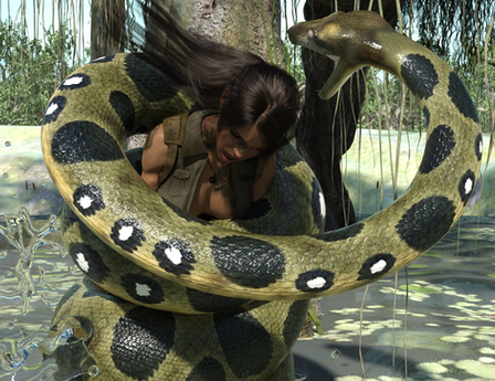 This one is inspired by a scene in one of the Anaconda sequel movies (I don't remember which one). Someone is pinned underneath a large tree branch and squeezed against it. I thought it was a really cool concept, so here's my version.Related content