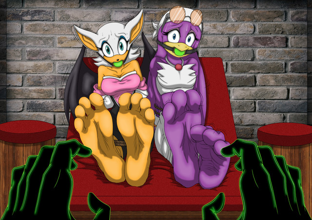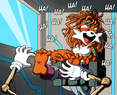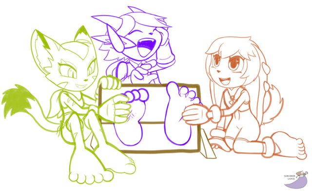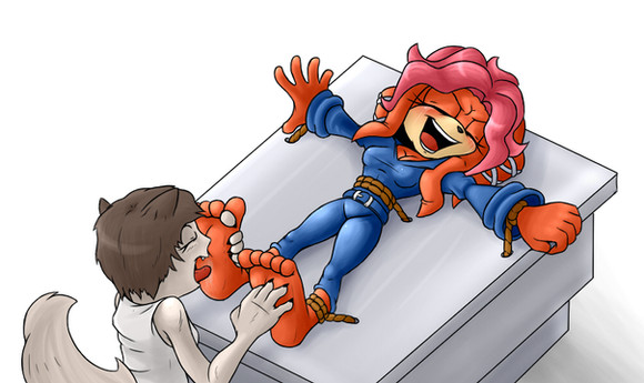 That and great work on her design and her cloths. It looks as well as I had hoped~! And just....my word those feet! They look so fantastic! Their shape, the toes! That blue blush! It makes me grin at the cuties ticklish predicament so much when I see the adorable tootsies that are being "tormented" heheh. And those lines near her toes..hehet hey must be going crazy from all the tickling~