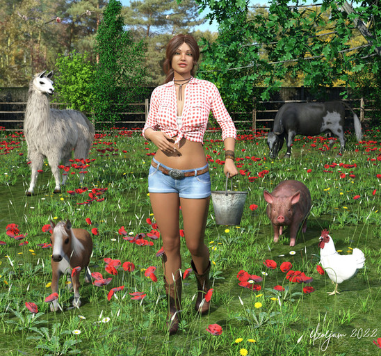 #barn #barnyard #cart #daisy #denim #dukes #farm #girl #hen #redhead #shorts #summer