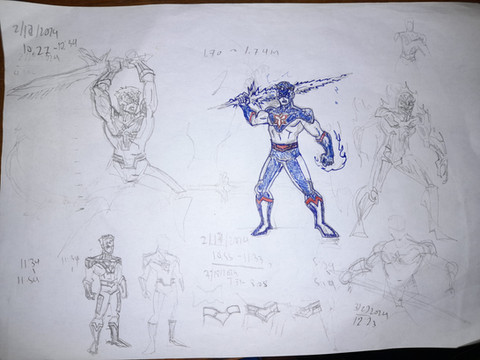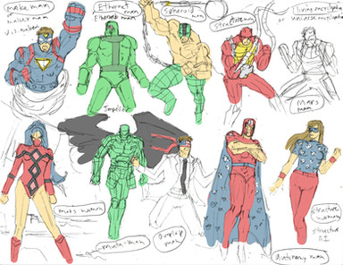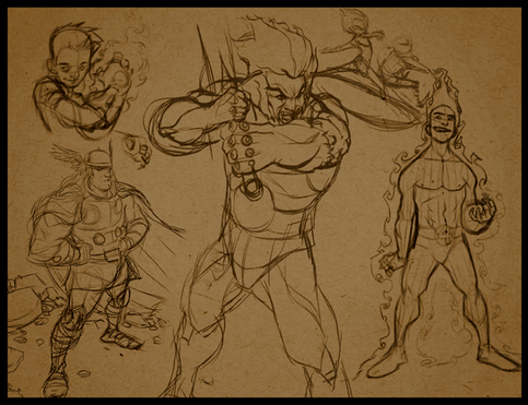 Looking through old sketch pads is a great trip down memory lane and provides plenty of fodder for warm up sketches...Here is a little remake of some characters from 1993-1994. On this "comic book cover" was a team called NATURAL DISASTERS, which in retrospect is not a good name for a group of heroes... maybe it could have been a comedy? Anyway, none of the characters were named so I reinterpreted this old line up with a water elemental-type, a tornado rider, some sort of fire knight, paired "thunder" and "lightning" heroes and an earth-based character. I like the way the knight and the rose quartz guy came out (the original is floating in front of some crystal projections... get it 'rose' because he's floating... I'm a nerd).