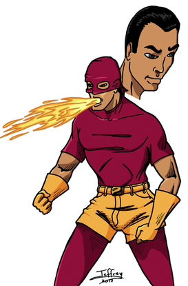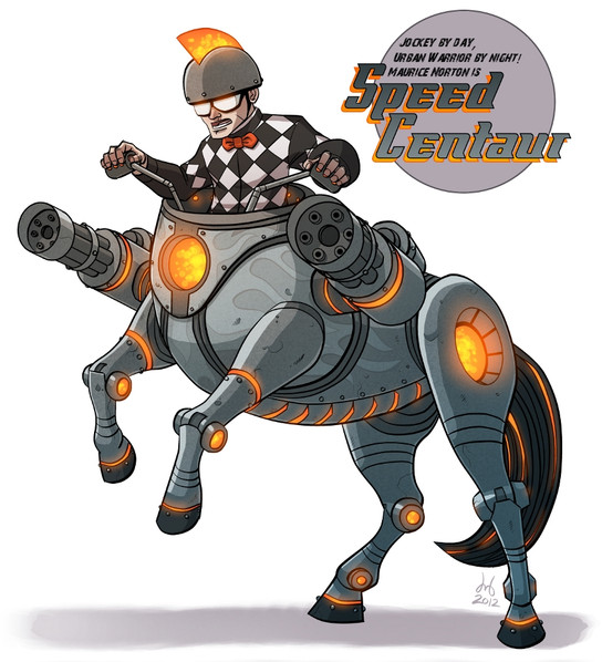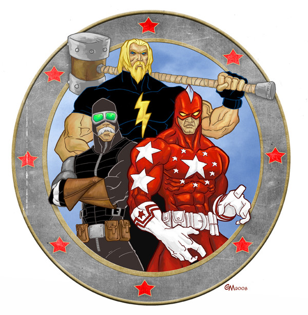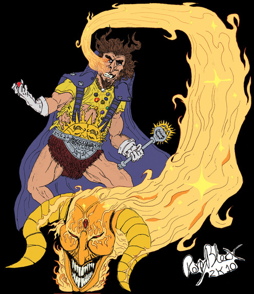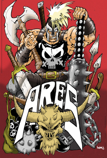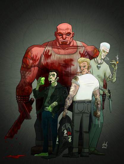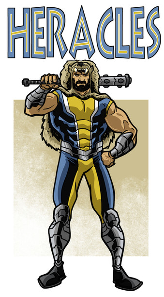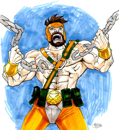 Tried out the last free version of OpenCanvas to draw and ink this. I was impressed with the "sketchiness" while drawing, but I think I will still ink with Manga Studio or GIMP.Municipal Museum security guards Lenny, Mac and Louie interrupted a burglary in the Ancient Greece exhibition. A blackened vase adorned with three dogs was smashed in the process releasing a cloud of mysteriously smoldering ash. The three guards stumbled into one another while blind and coughing. Upon touching the three men were fused into the behemoth now known as SERGEANT CERBERUS! With strength and size of three men, the SERGEANT combats demons and devils that have escaped from their fiery domain and he/they assist in the capture of those individuals so evil that the great-horned-one-from-below cannot wait to obtain them. The three heads have to work in unison as Lenny controls the right arm, Mac controls the legs and Louie controls the left arm. Are three heads really better than one?