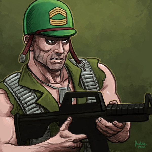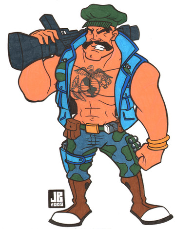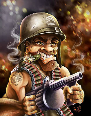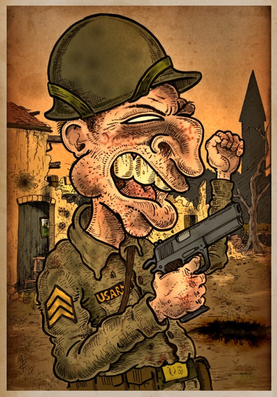 hiya doc! i love sgt rock as well and always wanted to draw him. anytime i tried he always looked too much like a 'ripping friends' cast-off, which wasn't what i was after (though nothing is wrong with those ripping friends). i intend for him to be a bit cartoony, but not by trading off his grit for goofiness. you gotta respect a guy like ROCK - a guy who carries around ammo that won't even fit in his weapons. he carries it so that he can simply press the 50 cal shells into any kraut's forehead with his thumb if they get too close!