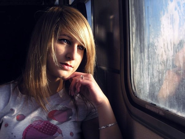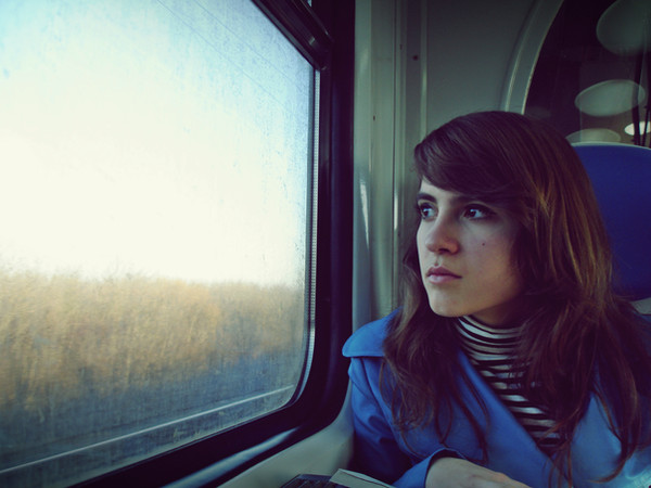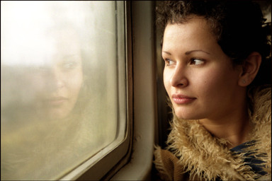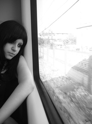 beautiful composition...i love the expression on the girls face,the expression on the guys face,the oncoming train,the movement outside the window and the stillness inside...lovely picture