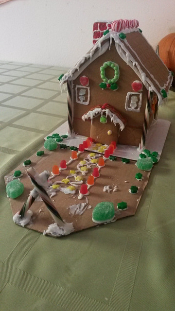 I know it looks like it has been involved in a car accident. That's because this is my first attempt at making a gingerbread house. First of all I had the tray the wrong way round and had no grooves to place the gingerbread into, then the icing bag was abysmal, to the opposite end to the nozzle, the bag split and the icing started coming out of a small hole so I had to transfer all the icing into a sandwich bag and snip the end off and work from there.though, I had loads of fun making it, I got the icing all over the tips of each finger and my thumbs as I tried to do it by hand and spread the icing on with my fingers instead of squeezing it on. I guess this is what season 8 of Game of Thrones will look like, haha.