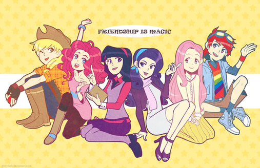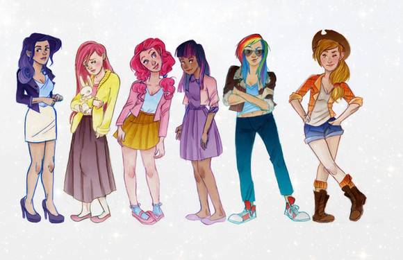 This is great in so many ways... The characters look so lively and dynamic. Their expressions and poses capture their characters. The clothing has a mix of fanon and original elements. I especially like Twilight's and Fluttershy's outfits -- they look different in a good way. Are Twilight's boots your own idea? I picture the thing Fluttershy's wearing being a cardigan -- she's the type of girl who'd hide in soft, baggy, comfortable clothes.