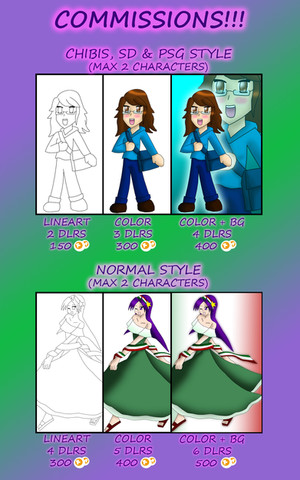 NOTE: You can send in your Commissions via Comments below this, or by Notes. Once all 3 slots have been filled, I will then close the commissions to work on them before I finally reopen them to receive new commissions.