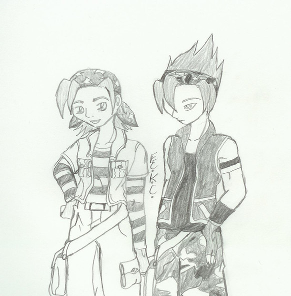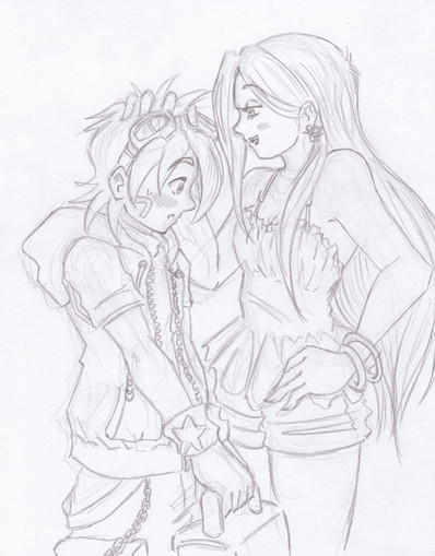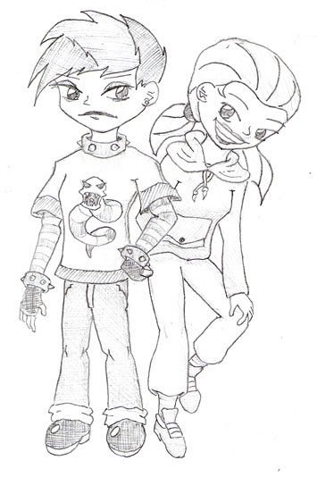 It's 11:12, and I'm noticing that I'm graduallt drawing better versions of Amyspirit's request, but the best so far is a sketch I just did on the side of my big sketch book. A small, itty, bitty sketch. I might just scan and... gulp... ink it.This is by far the 2 or 3rd best, and the best for drawing quality. Basically, Valerie wins stuffed animal in one of those shooting games, and danny fears her skills with good reason.
