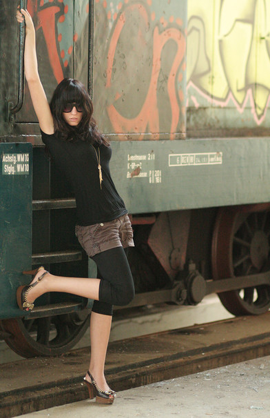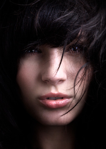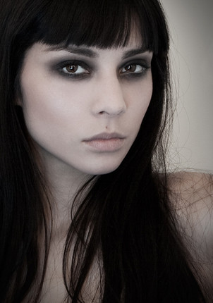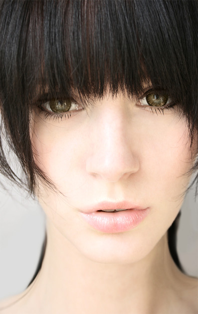 Interesting photo of a striking model! Her eyes seem to have an alien quality, peering out from beneath her bangs, the chocolate hair framing a face with sharp features!