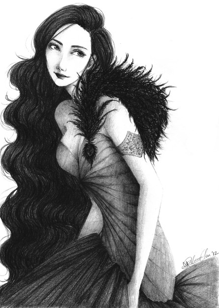 Seriously, wow. This is really awesome. You must finish it!! I adore her gloves, her hair with the loose curls, the necklace, the ruffles in the dress, the stockings, and the heels, and the peacock!!! Everything!! I especially like the pose and how well you drew the feet and shoes from that angle.