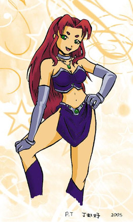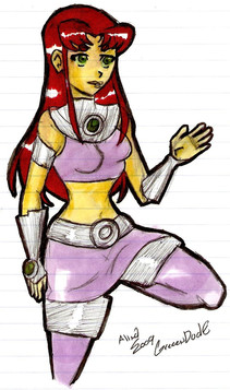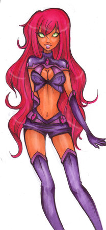 Starfire from Teen Titans cuz it's one of my favourite shows. I never do fanart, so I thought I'd start with TT. I still gotta do Robin and Cyborg. Robin is proving to be rather difficult, it's mostly his hair and mask, but I'm really looking forward to drawing Cy cuz I want him to look all shiny and badass. But yeah, Starfire.Starfire Β© DC
