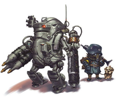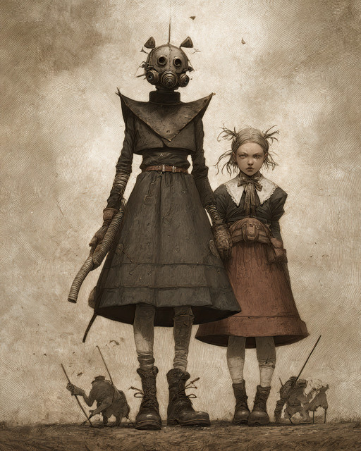 You've added other features which gives it a bit of a steam punk and/or aΒ medievalΒ feel (the helmet that covers his/her face and the long robes covering the body). That you choose to leave the painted background as loosely and foggy is a good touch which helps in making the two figures moreΒ prominent in details and form.