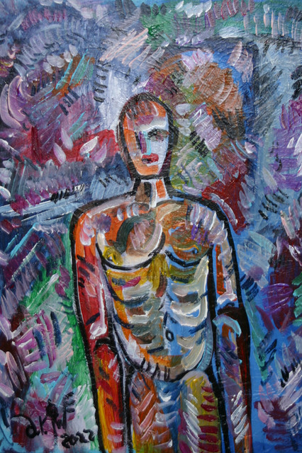 Abstract sculpture in a surreal style constructed in the same manner as Standing man. Stands 2 feet 3 inches tall, 2 feet wide, by 6 inches thick. free standing with no base. Finish is a silver spray paint.Related content