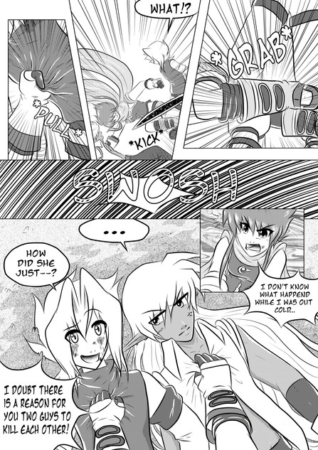 2) What sort of panel layout best communicates the movement of a fight? I'm usually fairly straight forward with my panel layout but, whenever I try draw out my fight, I feel like the simplicity of my panel layout is undercutting the movement of the characters. I tried something more energetic for the start of my fight and I love the extra UMF if adds but I'm worried that, if I did that sort of thing too much, it could overwhelm the actual fight.