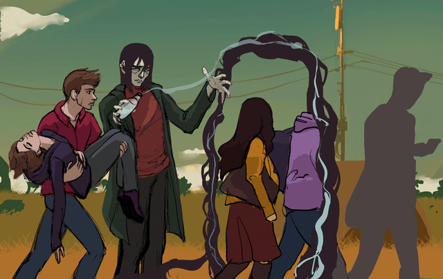I was looking forward to see more relic chasers art!! you're right family is not just blood! is Julian making a video of Buck with his phone?? I love Maya walking on the handrail, I think it's just perfect for the type of person she is! I would have made a more competitive expression on caleb's face! And maybe I'd have added some shadows on the bridge, on the objects etc! The rest of it is awesome! I love the dog! ^^ you should make some images with one of you characters petting the dog!! It would be lovely! great work!