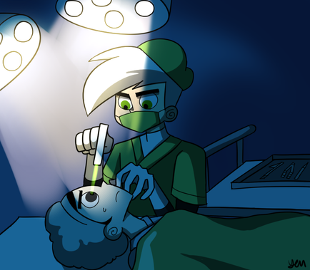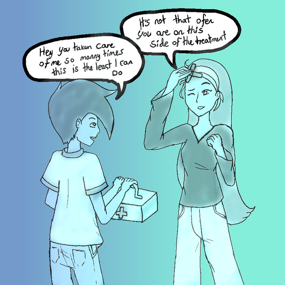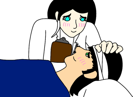 In summary, their OC who is a cute nurse, is giving Danny a check up by starting with the stethoscope to the chest to check his heartbeat, but I imagine right now his heartbeat might be a bit faster because he's blushing at this cute nurse looking after him.