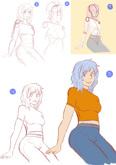 1. I begin to draw the pose roughly, using blocky shapes mainly, nothing too detailed. This stage is mainly focusing on nailing the pose I want down.