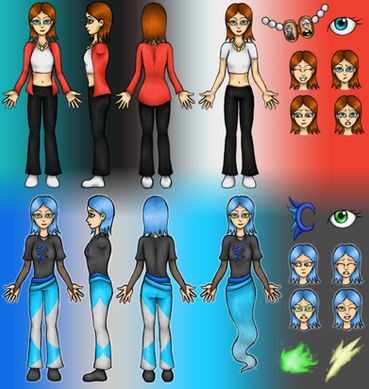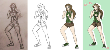 2. Then I refine the pose to a curved/semi-realistic form, adding clothes over the top and erasing any lines that would be hidden by clothing. Also I added all details, including eyes/eye direction, fingers, feet/toes and accessories.