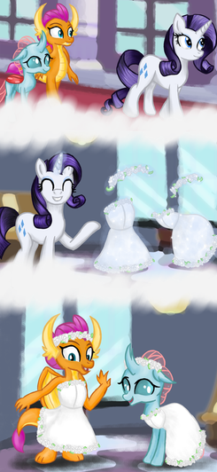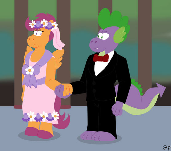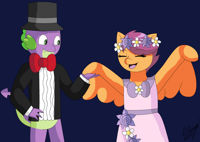 Phew, I'm happy with how this turned out. I was thinking of drawing Cadence, but I felt like it would draw attention away from the actual transformation of Spike and Scootallo, but I did include her magic to show their outfits have magically turned into wedding attire. I hope I did everything right