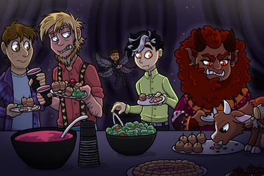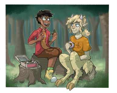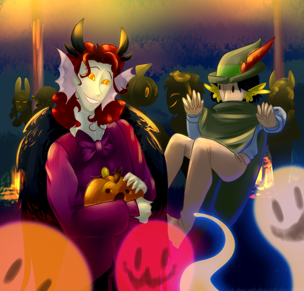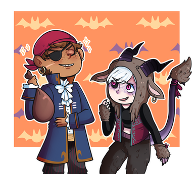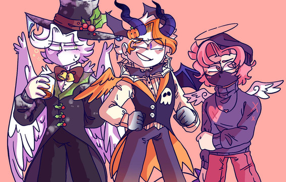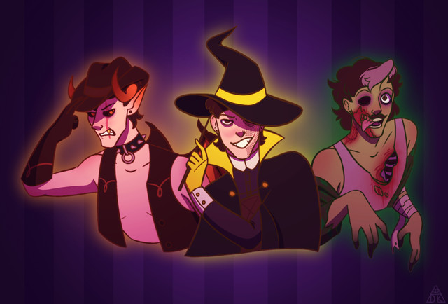 I really wanted to do something for halloween but I was busy. I did manage a doodle though!!Fun OC personality prompt: Do they like candy corn? Joshua (devil) here has the correct opinion in my book! He's got a HUGE sweet tooth and really just likes anything sweet - his boyfriend has a bit more "refined" tastes.