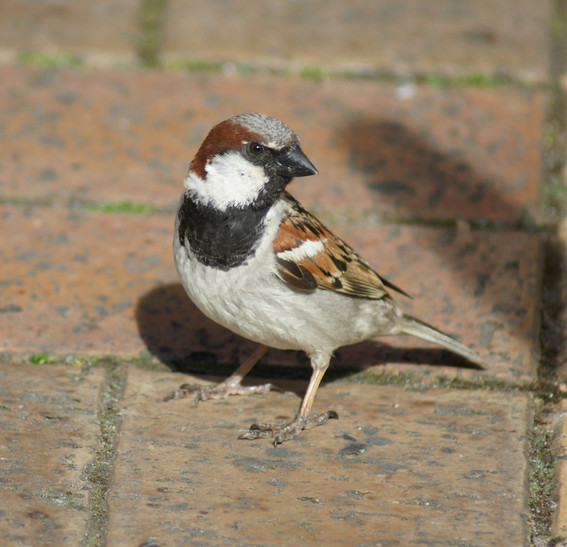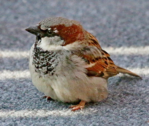 That's a beautiful male house sparrow. I see them all over the ground, where ever I go. TAKE MORE PICS!
