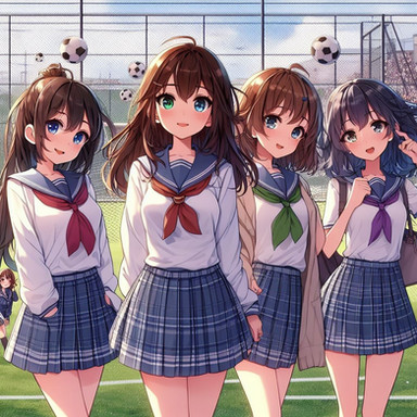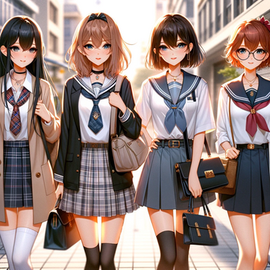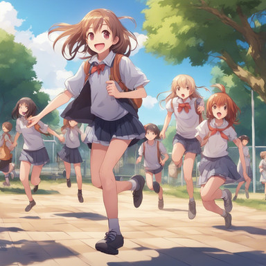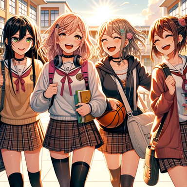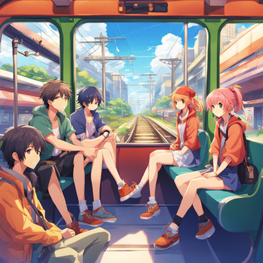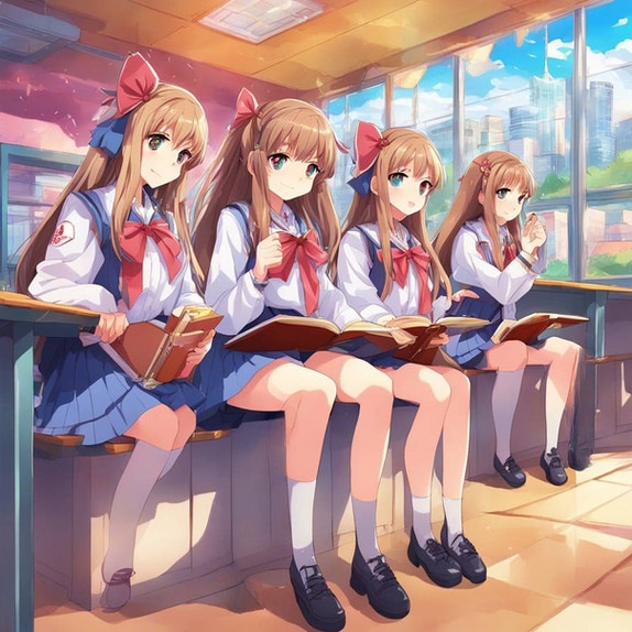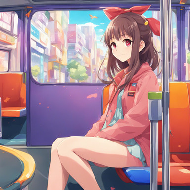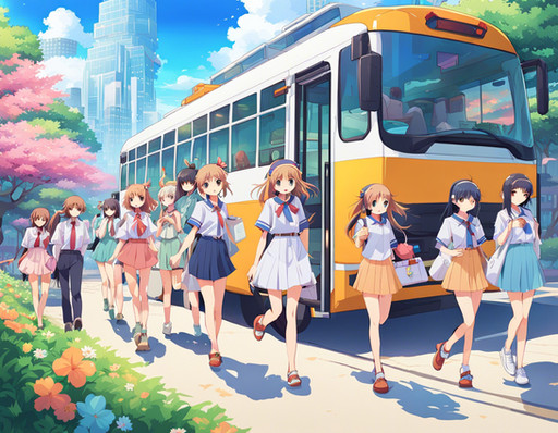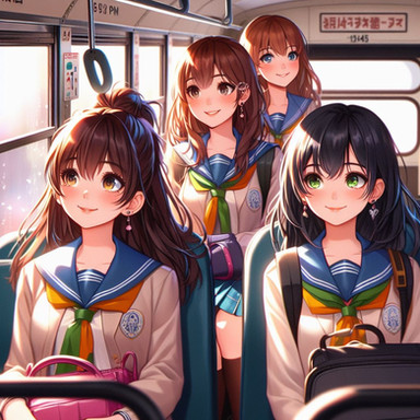 As the school day winds down, the school bus of Sakura High becomes a sanctuary of quiet reflection and relaxation. Akari, the dreamer with long black hair, gazes out the window, her thoughts as deep as the evening sky. Hina, with her inquisitive short blonde hair, immerses herself in a fascinating book, absorbing every word. Rio, with vibrant red hair, listens to her favorite music, her foot tapping in harmony with the rhythm. And Mei, the tech whiz with short brown hair, is engrossed in a game on her console, her fingers moving swiftly. As the bus glides through the city, bathed in the warm glow of the setting sun, each girl unwinds in her own way, their minds reflecting on the day's adventures and the promise of tomorrow.
