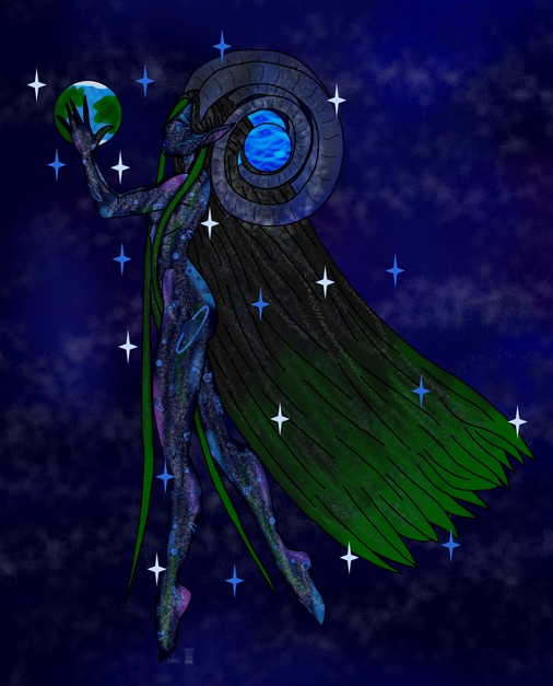 Not part of my mythology series just Earth personified. I was actually going to draw her smiling but I thought it over and there's very few things the Earth would be smiling about so I gave her a disappointed gaze. In a sense, you can interpret her expression and pose as anything from slight annoyance to withheld anger.I also experimented with transparency in the tan drape and also her hair, which is slightly transparent. Not my best work but meh its okay.
