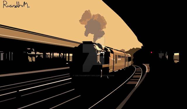 I create all my work in Adobe Illustrator. If a good photograph of my chosen subjectΒ is available (at the correct angle etc.) I just trace over the photograph with the pen tool and create a Live Paint Group to fill in the colours. In this case the train and platform came from one photograph, the building from another, and the smoke/steam was created by layering together a large number of circles.