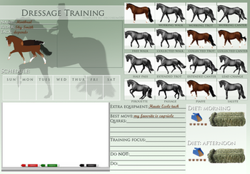 To the left, you will see info such as the horses ref, name, rider, and tack (I will not provide the tack in the free template, you have to draw your own) and below it is the horses training schedule. Each time the horse moves up a level, (beginner, intermediate, advanced, master) you will have to make a weeks worth of stories from the horses training sessions. It doesn't have to be an essay but you should include it just so it does seem like your horse is getting trained instead of just filling out the template.
