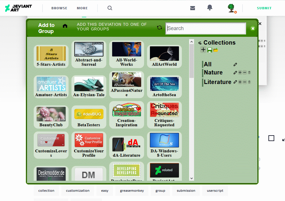 Oh, I uninstalled it, reinstalled it, and it still didn't work. Now, I was able to at least get the typing cursor over the search field, but it froze up again and that was my cursor for the whole page. It never switched until I closed the tab and uninstalled the script. It must be hard to fix it if you don't know the issue... It would probably help to rewrite the code! But, I think you might need a new script anyways, since this one is obviously a bit messy... Thank you for taking your time to rewrite this script. This is a great idea for deviantART and I would love to see it working soon!