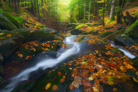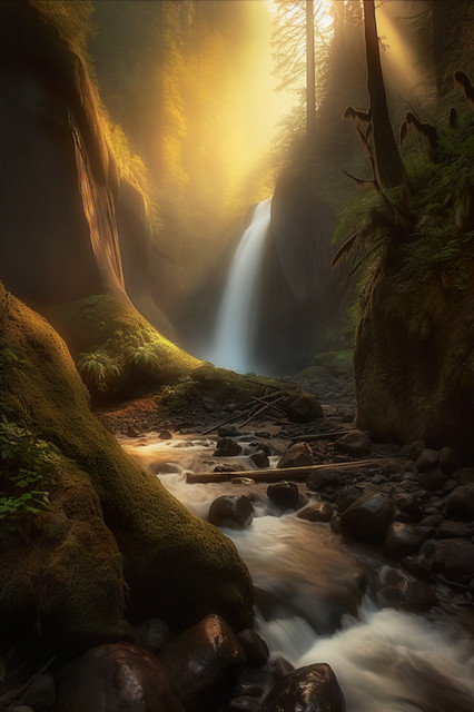 These falls in the Columbia River Gorge were one of my 'must see' destinations. As Tula Top and I set off on a morning hike, the conditions of clear blue skies did not look promising for waterfall photography but what a beautiful sight we were greeted with ! The rays of light lit up the waterfall spray and faint mist and leaves were scattered on the ground ( this one placed on the rock ).[Prints] Β [Facebook] Β [500px]